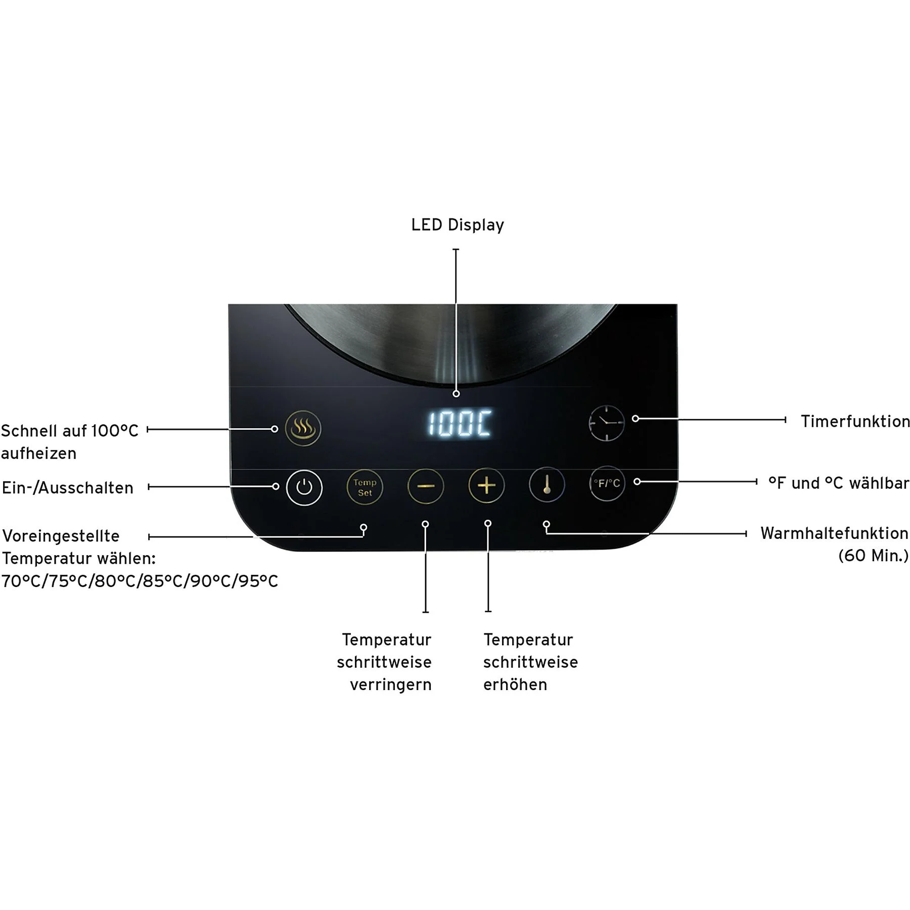 Zusätzlich können Sie durch die Warmhaltefunktion die ausgewählte Temperatur bis zu 60 min halten – ideal, wenn Sie Kaffee oder Tee aufbrühen wollen.