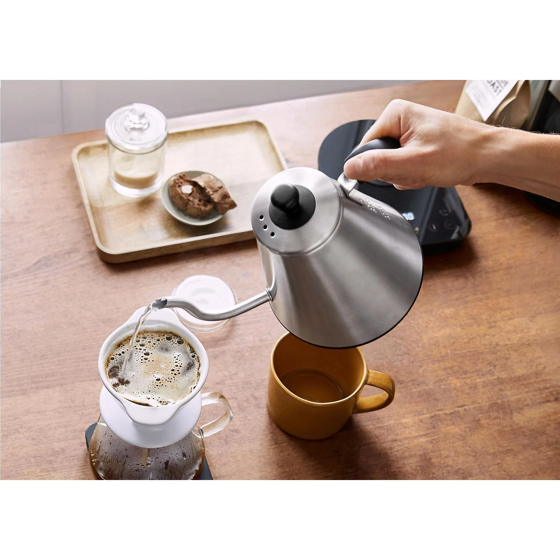 Dieser Wasserkessel hat die bewährte Schwanenhalsform für ein präzises Aufgießen sowie einen integrierten Timer zur Kontrolle des Brühvorgangs.