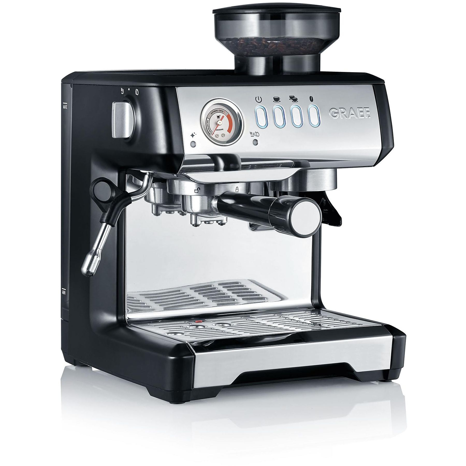 Wie auch die Mahlmenge für Kaffeemehl lassen sich die Kaffeemengen für Single oder Double-Espresso ganz einfach per Tastendruck programmieren. Sehr praktisch auch die um 360 Grad schwenkbare Profi-Lanze für schnellen Dampf oder Heißwasser.