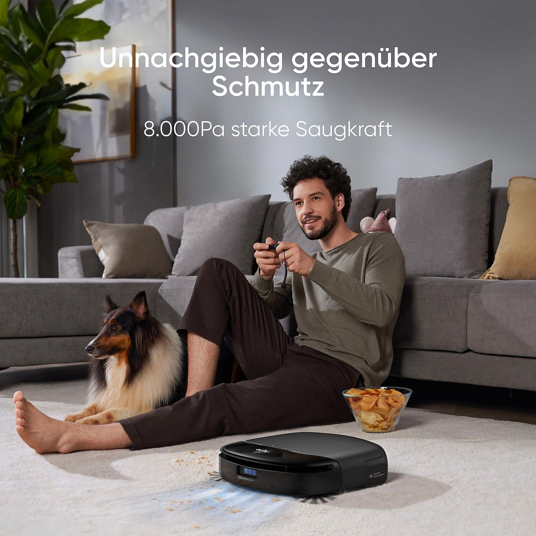 Besondere Merkmale | 8000 Pa Saugleistung, innovativer Rollmopp imitiert menschliches Schrubben, Eco-Clean Ozon Reinigung und Desinfizierung, 3D MatrixEye Tiefenerkennungssystem, LCD Touch Display, High-Speed Mapping, dToF Lidarnavigation, 3D SLAM Algorithmen, 55°C Selbsttrocknung, 150 m² Reinigungsfläche, automatischer Dosierer für Reinigungslösung |