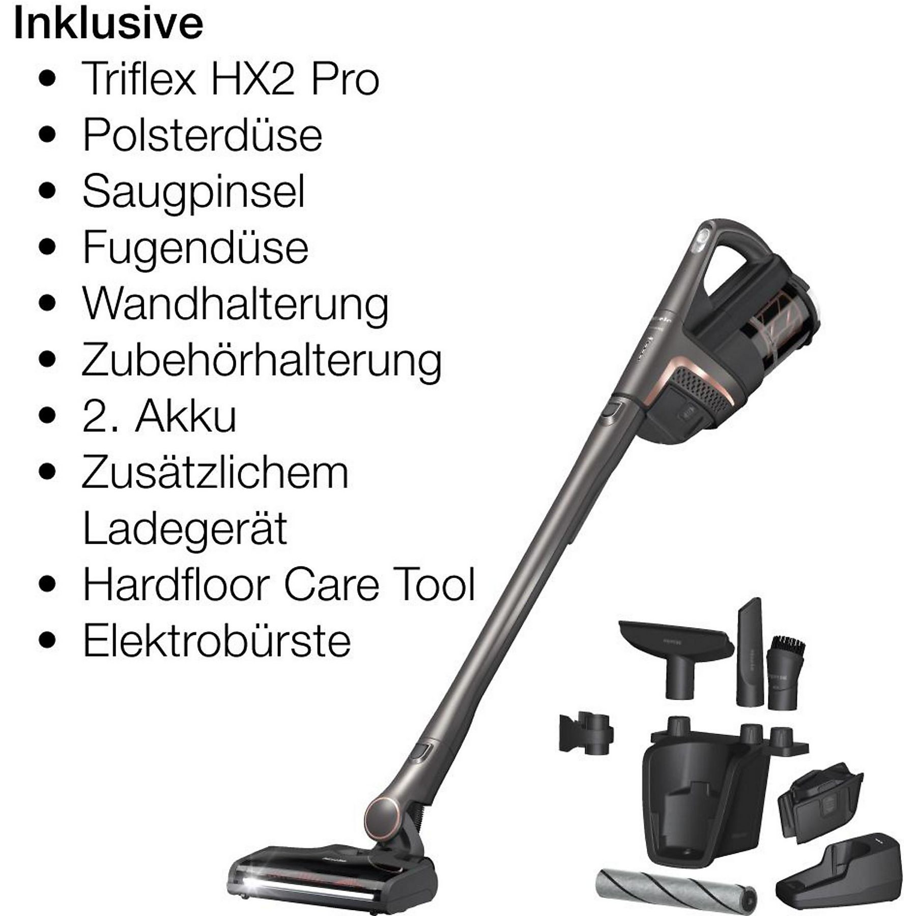 Lieferumfang | Stielsauger, Elektro-Bodenbürste, Zweit-Akku und separater Akku-Ladeschale, Bedienungsanleitung Lieferumfang gilt nur bei neuen Produkten |